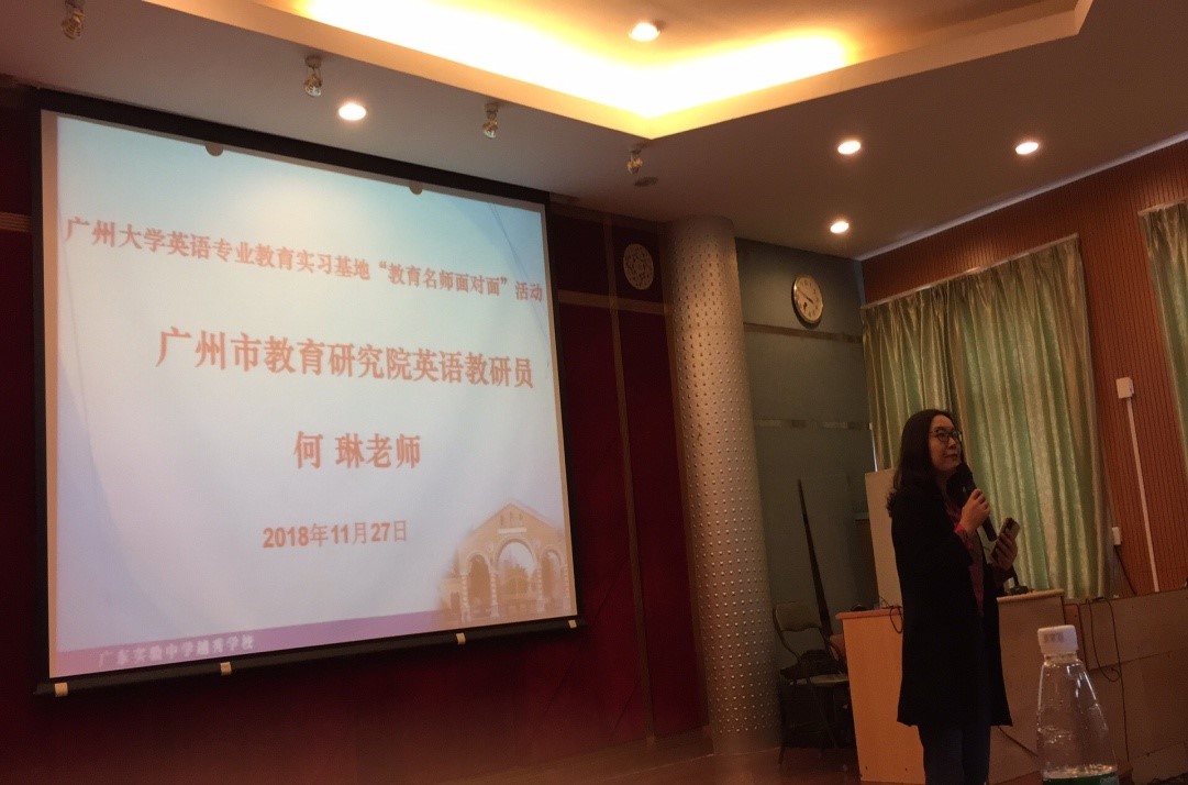 英语(教师教育)专业25名大三学生在该校见习之机,邀请到广州市教育研究院教研员何琳老师在盘福校区礼堂里为该校英语科组教师以及25名见习生开展91自拍讲座和交流活动。省实越秀陈浩杰副校长、91自拍