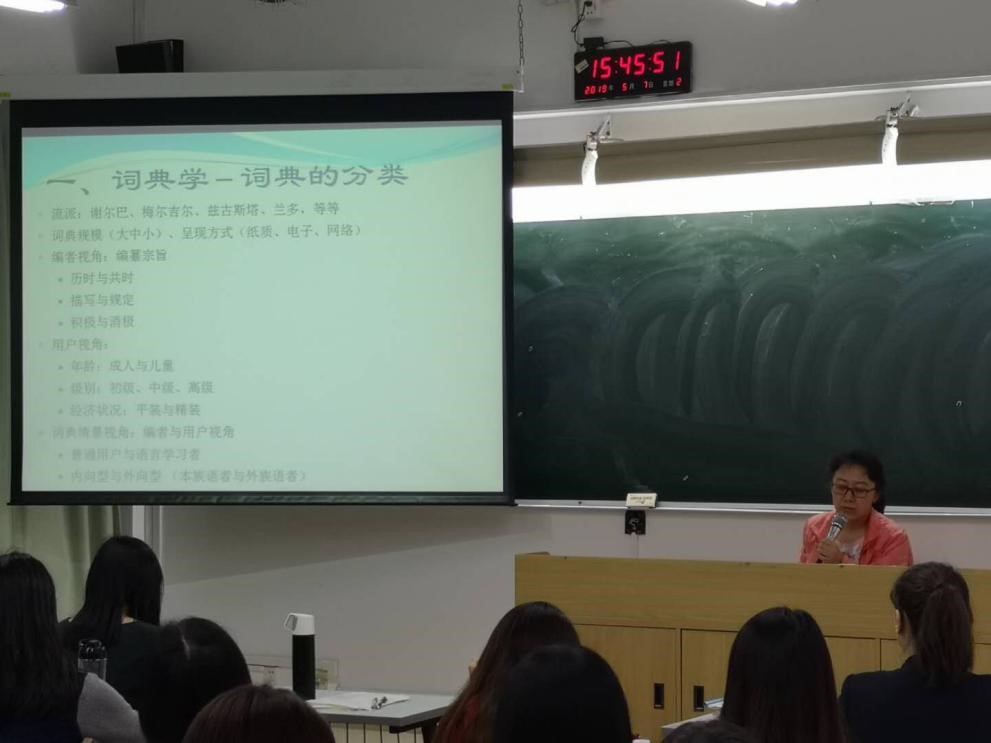 冯雪飞老师从词典学、认知语言学和习语研究三方面介绍了自己的研究专长,结合例子向学生传递“小题细做”的思想。