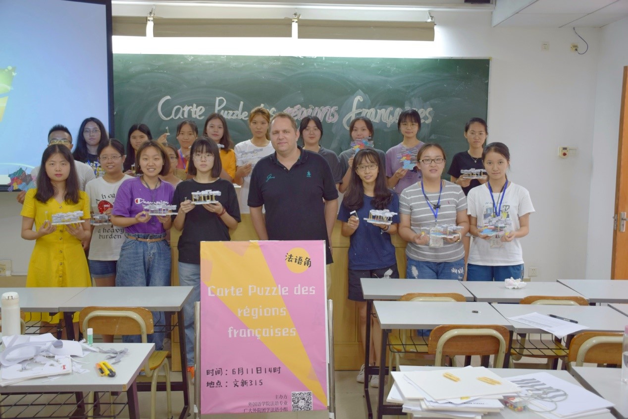 6月11日下午,91自拍 西语系本学期第三次法语角活动在文新315如期举行。活动在外籍教师Sébastien Damry的耐心指导下顺利展开,法语专业同学积极参与,学习热情高涨。借助拼图等一系列有趣的活动,在轻松愉快的氛围中Sébastien Damry老师带领同学们了解法国的一些政区知识和美食文化。此次活动寓教于乐,不仅使同学们增进了对法国文化的了解,并且进一步培养了同学们法语学习的兴趣。