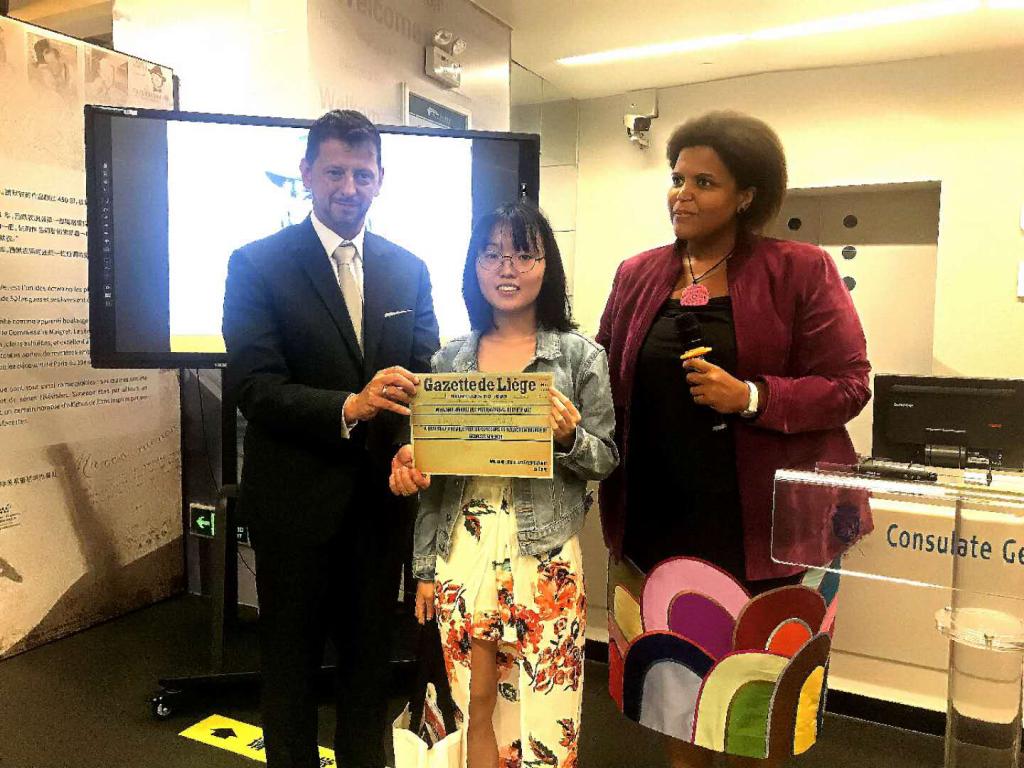 (从左至右:比利时驻穗总领事邵德辉先生,冯颖欣、比利时大使馆瓦隆-布鲁塞尔国际关系署驻华办事处负责人丁爱宇女士)