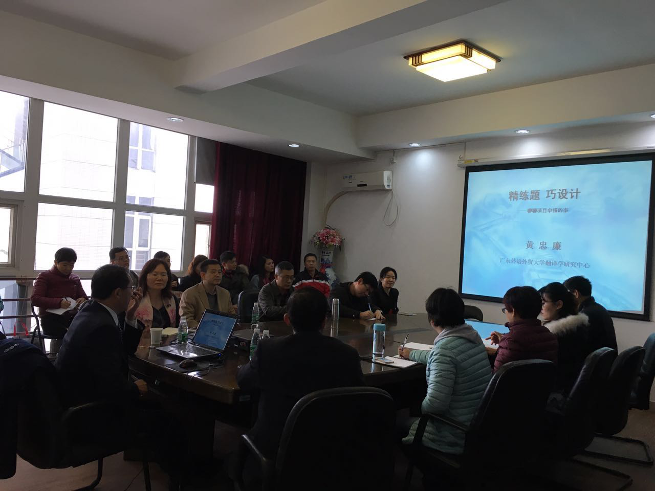 “国家社科基金规划项目和教育部人文社科规划项目”申报系列辅导活动第四场活动在行政东前座333室举行。广东外语外贸大学黄忠廉教授作了题为“精练题 巧设计——聊聊项目申报的事”的91自拍讲座,院长肖坤学教授出席并主持本次讲座,三十多位老师参加了讲座。