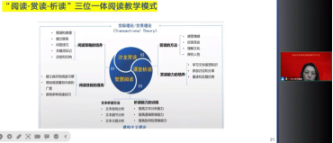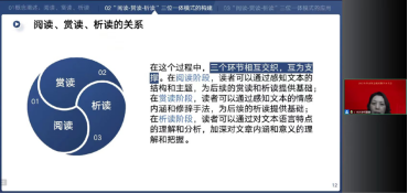 会议中,何爱晶教授首先对“阅读”、“赏读”以及“析读”的定义进行了阐释,并以交际理论(Transactional Theory)和建构主义理论为基础,提出“阅读-赏读-析读”这三个环节应相互交织、互为支撑的观点:即在阅读阶段,读者可以通过感知文本的结构和主题,为后续的赏读和析读提供基础;在赏读阶段,读者可以通过感知文本的情感内涵和修辞手法,为后续的析读提供基础;在析读阶段,读者可以通过对文本语言特点的理解和分析,加深对文章内涵和意义的理解和把握。