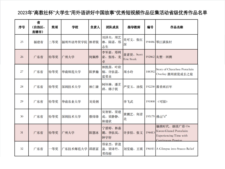 本科学生作品《灰塑·回溯》(团队成员:何佩桦、李军豪、郑利豪、张祎、龙卓,指导老师:翁素贤、Scott Eric Stork)和作品《触摸时代,继续广彩》(团队成员:陈慧冰、宁碧婷、林嘉鹏、李依岚、钟宇轩,指导老师:许多恬、张文)双双荣获省级特等奖,继续晋级全国交流活动。